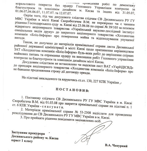 Несмотря на столь вопиющие факты, Деснянское РУГУ МВД Украины в г. Киеве приняло постановление не заводить уголовное дело по фактам вывоза зараженной земли. После того, как журналисты «Багнета» вновь подняли эту тему, ряд народных депутатов откликнулись на выступления СМИ. В органы власти были направлены повторные депутатские запросы. И вот недавно зашевелились и правоохранители. Прокуратура Деснянского района отменила прежнее постановление районных милицейских чиновников об отсутствии состава преступления в действиях ЗАО «ХК «Блиц-Информ». Милиционерам поручено провести дополнительную проверку с указанием конкретных мер, которые необходимо провести для принятия окончательного решения (см. фото ниже). Конечно, сложно вникать в казуистику эпистолярного жанра чиновников, но в данном случае речь идет о том, что прокуратуру не удовлетворили общие отписки милиционеров Деснянского района – мол, отсутствует состав преступления.