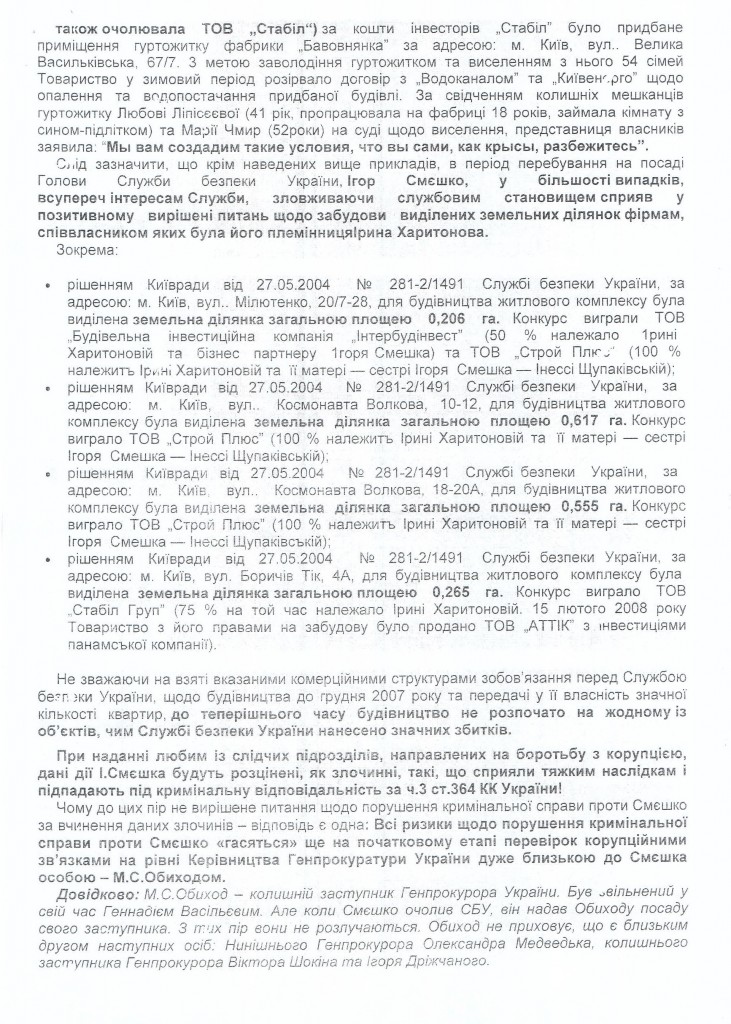 Следует отметить, что кроме приведенных выше примеров, в период пребывания в должности Председателя Службы безопасности Украины Игорь Смешко, в большинстве случаев, вопреки интересам службы, злоупотребляя служебным положением содействие в положительном решении вопросов по застройке выделенных земельных участков фирмам, совладельцем которых была его племянница Ирина Харитонова. Офицеры сообщают еще о как минимум 4 земельных участках в Киеве, которые команда Смешко получила под застройку.