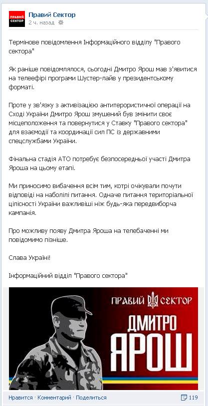 «Как ранее сообщалось, сегодня Дмитрий Ярош должен был появиться на телеэфире программы Шустер - лайв в президентском формате. Однако в связи с активизацией антитеррористической операции на Востоке Украины Дмитрий Ярош вынужден был изменить свое местоположение и вернуться в Ставку «Правого сектора» для взаимодействия и координации сил ВС с государственными спецслужбами Украины», - говорится в сообщении.
