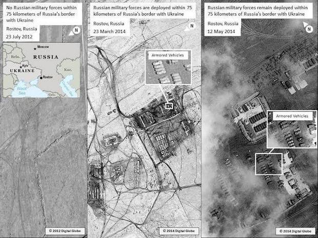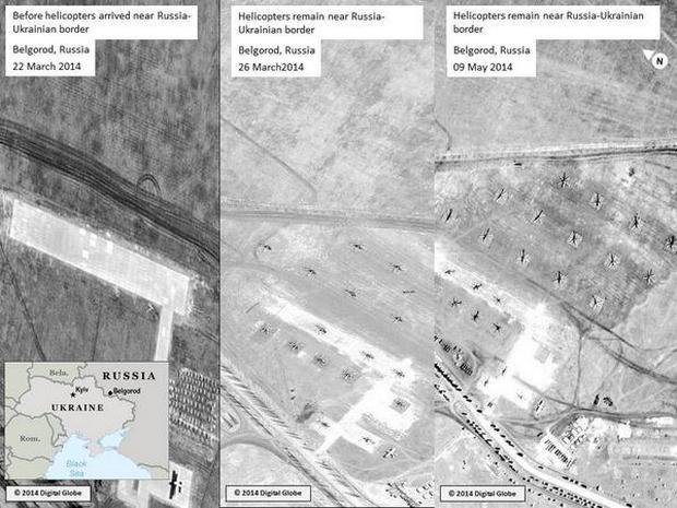 Спутниковые фотографии частной компании, опубликованные государственным Департаментом США и в твиттере миссии США в НАТО, показали около 20 российских вертолетов в Белгородской области, недалеко от украинской границы, состоянием на 9 мая. На снимках от 22 марта вертолетов под Белгородом не было. На другом фотоснимке от 12 мая виден отряд российских броневиков, расположенный в Ростовской области в 75 километрах от границы с Украиной. Эти же броневики находятся и на снимке от 23 марта.