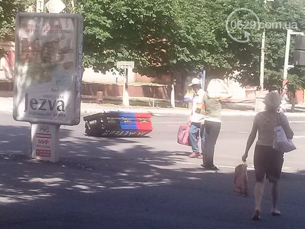 Сегодня в Мариуполе прошел флеш-моб, которым «скорботовцы» ответили террористам. По проспекту Ленина в сопровождении нескольких автомобилей возили гроб. Причем он был выкрашен в синий, красный и черный цвета – флаг террористической ДНР.