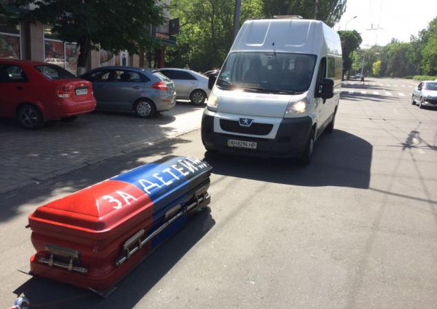 «Таким образом, разукрасив гроб в цвета флага ДНР, мы решили отреагировать на угрозы от представителей республики в адрес наших семей и детей», - отметил один из владельцев службы ритуальных услуг Николай Сапаров и добавил, что на одной стороне было написано «За детей», а на другой – «Вон из города».