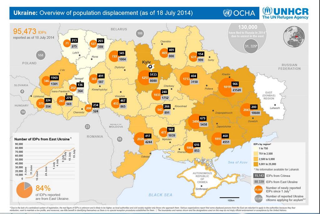 «По данным Управления ООН по делам беженцев, на 18 июля число внутренне перемещенных лиц в Украине достигло 95,473», - говорится в сообщении.