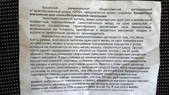 На днях некоторые жители Симферополя обнаружили в своих почтовых ящиках интересные листовки с говорящим заголовком «Гарантированный доход +25%», отпечатанные тиражом 1000 экземпляров. На лицевой стороне присутствуют контакты координаторов проекта и вот такая длинная фраза: «Проект создания Кредитных магазинов для самообслуживания населения осуществляется под патронатом кандидата в депутаты Симферополского городского совета Республики Крым по одномандатному избирательному округу №4 Финошкина Дмитрия Сергеевича».