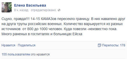 «В них наваленные друг на друга трупы российских военных.... Куда повезли - пока не известно. Много раненых в госпиталях и больницах Ейска», - добавила она.
