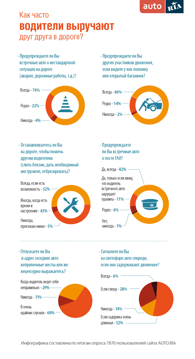 Сайт AUTO.RIA.com провёл опрос среди своих пользователей с целью выяснить, как часто украинские автомобилисты выручают других водителей в дороге. Во время опроса оказалось, что большинство водителей помогают своим «коллегам по дороге» если не физически, то подмигиванием фар.