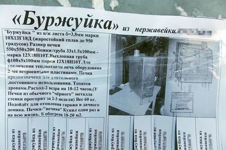 В контролируемом боевиками Донецке начали продавать буржуйки. Как отмечает Остров, объявление размещено на стенде в районе торгового центра «Золотое кольцо» в центре Донецка. 8 октября 2014 года.
