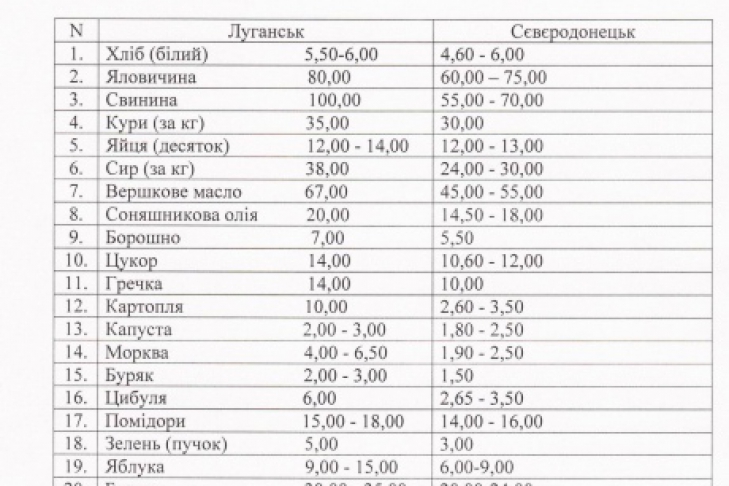 При этом губернатор привел сравнительную таблицу цен на основные продукты питания в Луганске, который находится под контролем сепаратистов, и Северодонецке Луганской области, который контролирует Украина.
