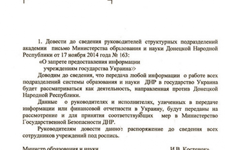 В частности в Донбасскую национальную академию строительства и архитектуры было направлено письмо с требованием не предоставлять законным украинским властям информацию о деятельности ВУЗа.