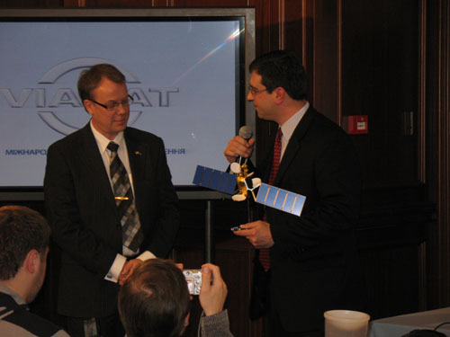 Генеральному директору Vision TV Ричарду Капрани вручают макет спутника Sirius 4