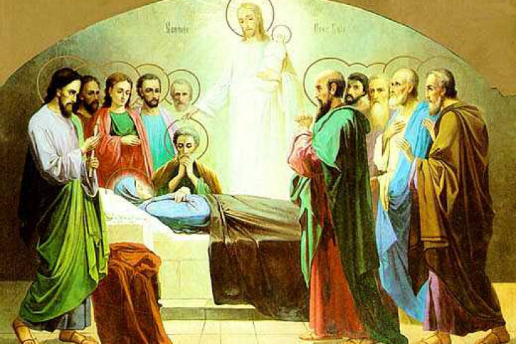 Согласно церковным сказаниям, в этот день апостолы чудесным образом собрались в Иерусалиме из мест, где они проповедовали, чтобы попрощаться с Пресвятой Богородицей и осуществить погребение ее пречистого тела. Находясь вокруг ее ложа, они были ослеплены ярким светом, в котором явился сам Христос в окружении ангелов и архангелов. В этот момент чистая душа Девы Марии без страданий, будто во сне, отошла к Господу. Иконографическая традиция праздника рассказывает, что Богородица отдала свою чистую душу в руки своего Сына и Господа Иисуса Христа, а в это время с небес раздавались звуки ангельских хоров.