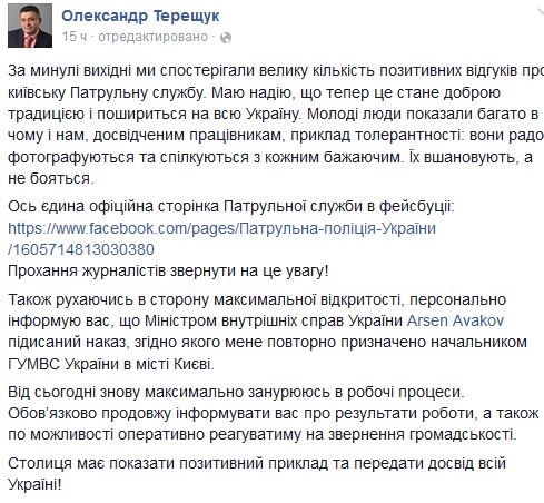 "Также двигаясь в сторону максимальной открытости, персонально информирую вас, что министром внутренних дел Украины Арсеном Аваковым подписан приказ, согласно которому меня повторно назначен начальником ГУМВД Украины в городе Киеве", - заявил Терещук.