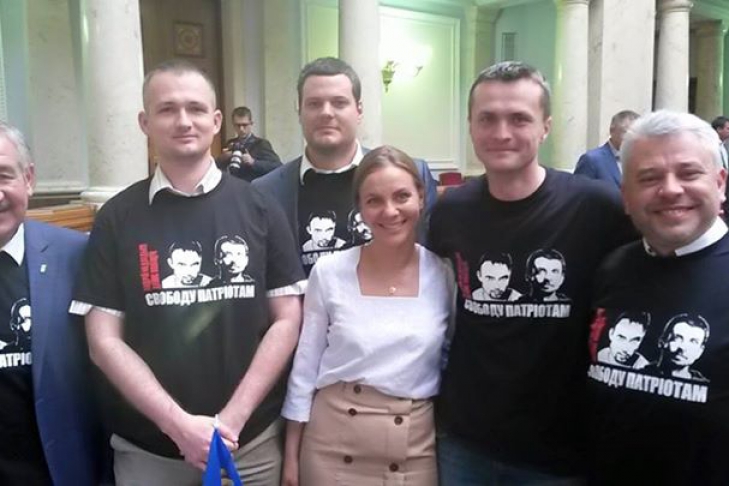 Народные избранники Владимир Парасюк, Виталий Куприй, Дмитрий Добродомов, Игорь Луценко и еще несколько нардепов оделись в футболки, на которых изображены фотографии заключенных с подписью "Свободу патриотам".