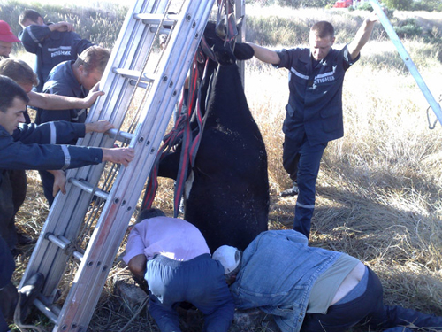 Первый случай произошел в поселке Черноморка Очаковского района. Во время выпаса скота возле очистительных сооружений в колодец глубиной 2,5 метра упала корова. По вызову пастуха спасатели выехали на место происшествия. Во главе с начальником Очаковского райотдела МЧС спасатели, с помощью пожарных ручных лестниц и лебедки, достали корову со дна колодца.