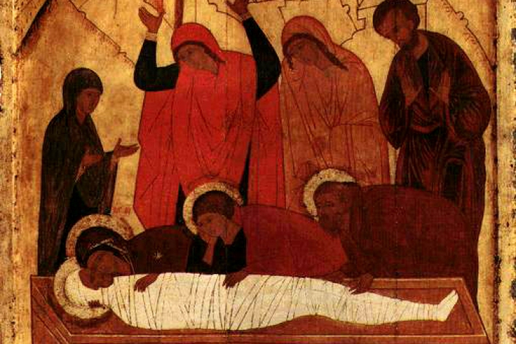 Иосиф купил плащаницу - длинное и ценное полотно. Тело Христа сняли с креста, умастили его благовониями, обвили плащаницей и положили в новой погребальной пещере в саду Иосифа.