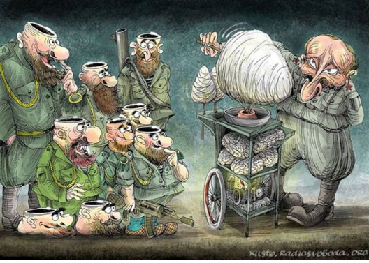 Третье место занял карикатурист из города Вишневое Киевской области. На ней Алексей Кустовский показал, как Путин делает ватные мозги жителям оккупированного Донбасса и россиянам.