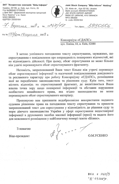 Но, похоже, это было сделано Усенко только для отвода глаз – на самом деле никто ничего публиковать не собирался. В ответ на его письмо из «ЕДАПС» ушло официальное письмо с текстом опровержения. Опровержение в газете так и не вышло. Зато господин Усенко присылает очередное письмо от 7 сентября 2009 г. (см. ниже фото документа), в котором он отказывается публиковать текст опровержения.