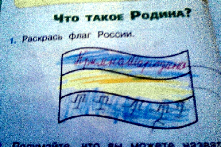 Как сообщается, на уроке "Окружающий мир", выполняя задание "Раскрась флаг России" в разделе "Что такое Родина?", ученик вместо триколора выкрасил шаблон в желтый и голубой цвета (цвета украинского флага - ред.), несколько раз нарисовал тамгу (национальный герб крымских татар - ред.) и сделал надпись "Крымнашародина".