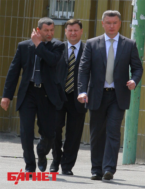 В Деснянском райсуде Мельничук (на фото справа) ни на шаг не отпускал от себя охрану. Да он и по собственной компании без охраны даже в туалет не ходит