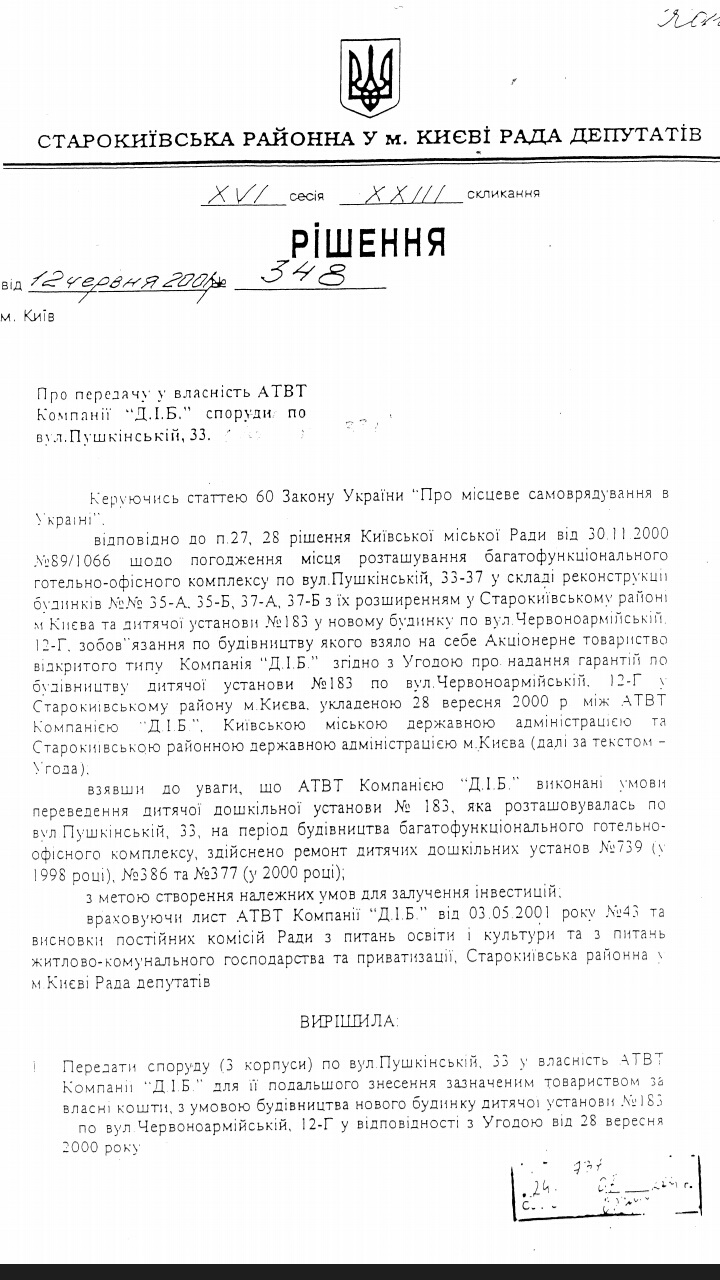 Есть смысл сжато повторить суть. В 2000-м году компания «Д.И.Б.» получила от городской власти помещение детского сада №183. Садик был признан аварийным еще в 1994 году, корпуса – в аренде различных коммерческих структур, а в одном крыле ютились 25 детей. Местная власть в то время не имела средств даже на снос ветхого объекта. Поэтому Старокиевская районная Рада передала проблемный объект инвестору, который в обмен предварительно реконструировал за свои средства три близлежащих детских сада, в один из которых были переведены дети из аварийного 183-го. По просьбе самого районного Управления образования, был также приведен в порядок фасад зданий, где оно располагалось.