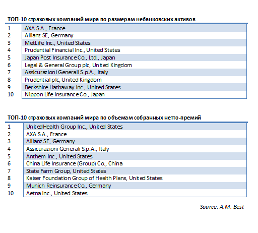 По данным AM Best в десятке самых крупных страховщиков по объемам нетто-премий в этом году оказалось пять американских компаний. Подобный рост был преимущественно вызван рядом приобретений лидерами списка компаний по страхованию здоровья.