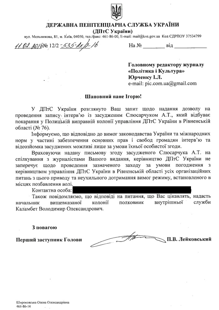 Редакція ПІКу висловлює подяку керівництву Державної пенітенціарної Служби України: до нашого радісного подиву редакція отримала офіційний дозвіл на спілкування з начальником колонії. Забігаючи вперед зазначимо – інтерв’ю з полковником внутрішньої служби Володимиром Каламбетом та лікарем медичної частини колонії Віктором Калішем просто на шматки рве шаблони суспільних стереотипів, сформованих щодо Слюсарчука слідством, прокуратурою, судами та пресою, і ставить багато запитань до тих, хто трудився над створенням образу «дебіла-зарізяки».