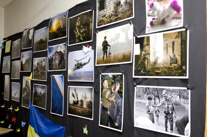 Рядом с ветеранами в зале сидели и новые герои – участники АТО. Дмитрий Юрьевич Муравский, отец наших учеников, сейчас сражается на востоке, передал музею желто-голубой стяг, который был с нашими бойцами в Донецком аэропорту. В лицее открыта выставка его фоторабот из зоны АТО «Мужество и подвиг сквозь поколения».