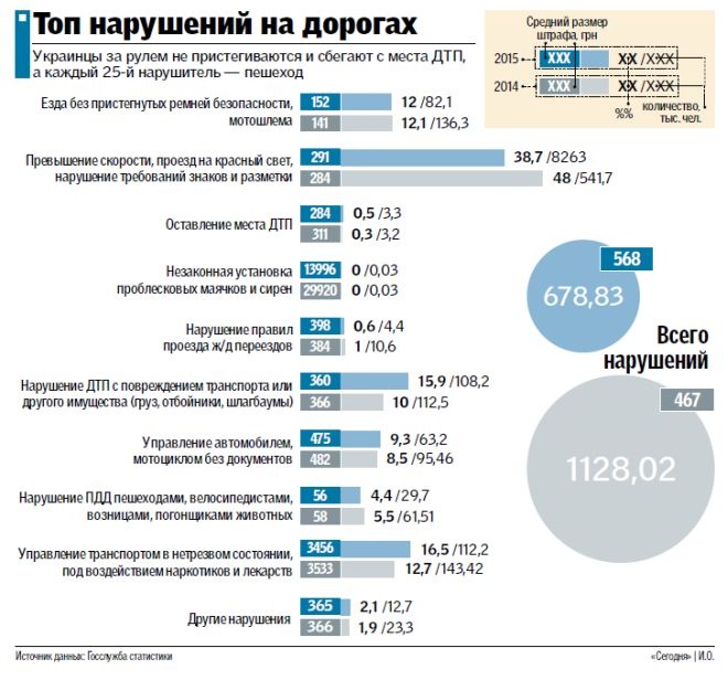 ЗА ЧТО. По-прежнему больше всего наказывают водителей за превышение скорости, игнорирование требований знаков и дорожной разметки — таких нарушителей 38,7%, или почти каждый 4-й из 10 (год назад было 48%). Каждый 6-й наказан за пьянство за рулем или за то, что был виновником ДТП (в 2014 г. пьяным был каждый 8-й, а спровоцировал аварию каждый 10-й). Зато водители стали немного лучше пересекать ж/д переезды — 0,6% нарушений, было 1%. По-прежнему, несмотря на огромные штрафы (сейчас 8500 грн, ранее 42 тыс. грн), по 30 человек в 2014-м и 2015 г. задержаны за езду с незаконно установленным проблесковым маячком и сиреной. А вот количество задержанных пешеходов и велосипедистов в 2015 г. упало почти в два раза — таких нарушителей всего 29 тыс. человек (в 2014 — 61 тыс.). Все полученные штрафы идут в бюджет, а уже там распределяются по разным сферам. То есть вполне возможно, что пьяный водитель поучаствовал в строительстве школы.