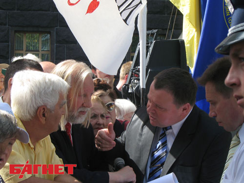 Записав в блокнот все требования военных пенсионеров, чиновник из правительства пообещал передать их премьер-министру, но мало кто поверил его обещанию Впрочем, вскоре митингующие смогли договориться, и начали выступать по очереди: десять минут – приверженцы Черновецкого, десять – СДПУ(о) и десять – ветераны силовых структур. Вскоре к митингующим вышел представитель правительства – работник пресс-службы Кабмина, как он представился. На просьбу «Багнета» назвать свое имя и фамилию, чиновник ответил категорическим отказом. Записав в блокнот все требования военных пенсионеров, он пообещал передать их премьер-министру.