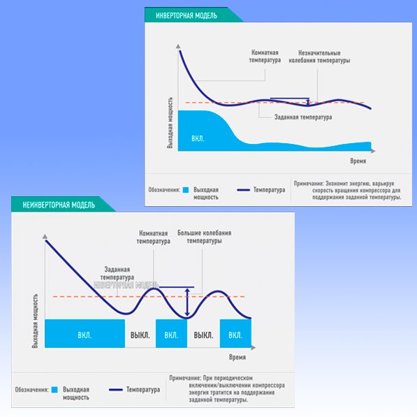 Кондиционер с инверторной технологией — одно из самых прогрессивных достижений нынешней техники. Применение инверторной технологии подразумевает точное управление работой компрессора. Инвертор преобразует ток, подаваемый на компрессор, регулирует мощность его работы. Для поддержания заданной температуры обычному прибору приходится периодически отключаться и включаться заново. Для той же цели инвертор лишь плавно понижает или повышает мощность компрессора.