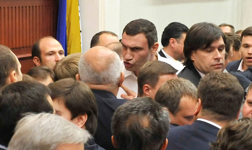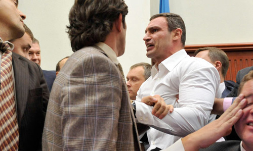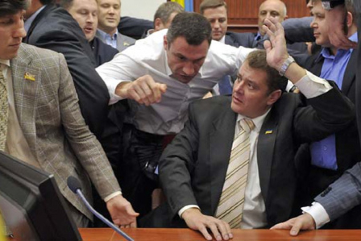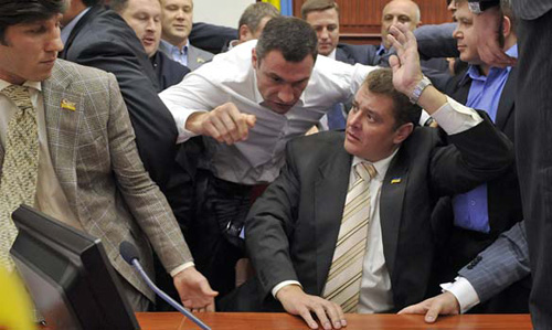 Сегодня британское издание Times опубликовало вчерашние снимки блокады трибуны в киевской мэрии, где очень хорошо видно, что Виталий Кличко никого не бил, как пытаются преподнести ситуацию многие украинские СМИ. Кроме того, Виталий Кличко громко предупредил, чтобы «все отошли назад».
