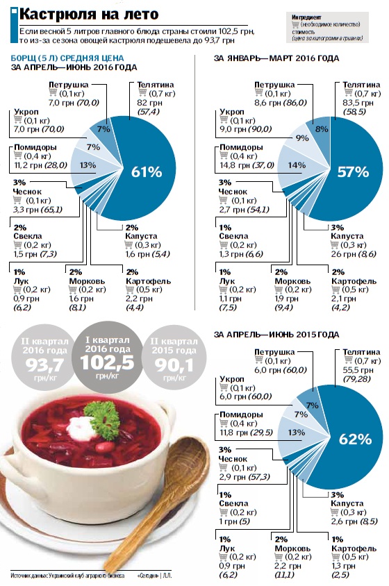Летом кастрюля любимого украинцами красного борща обойдется в 93,7 грн. Это на 8,8 грн, или почти на 10%, дешевле, чем весной, говорят эксперты, поскольку сейчас подешевели базовые овощи, входящие в состав борща, — капуста, морковь, лук, помидоры. Причем стоимость борща к осени может еще немного снизиться, ведь в сентябре-октябре борщовый набор традиционно находится на ценовом минимуме. "Сегодня" совместно с экспертами Украинского клуба аграрного бизнеса сравнила летний и весенний индексы борща, а также вспомнила, сколько он стоил год назад (см. инфографику).