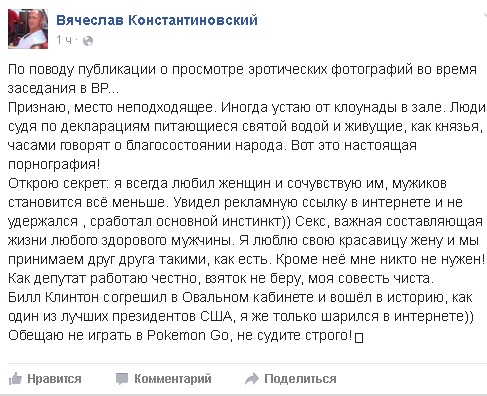 "Визнаю, місце невдале. Іноді втомлююся від клоунади в залі. Люди, судячи з декларацій, харчуються святою водою і живуть як князі, годинами говорять про добробут народу. Ось це справжня порнографія! Відкрию секрет: я завжди любив жінок і співчуваю їм, мужиків стає все менше. Побачив рекламне посилання в інтернеті і не втримався, спрацював основний інстинкт. Секс - важлива складова життя будь-якого здорового чоловіка", - написав нардеп.