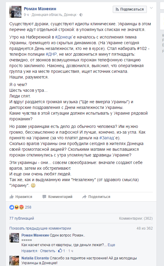 В подконтрольном незаконным вооруженным формированиям Донецке утром 24 августа на Набережной раздались звуки Гимна Украины. Об этом написал так называемый консультант самопровозглашенной "Донецкой народной республики" Роман Манекин на своей станице в Facebook, хотя позже пост был удален или скрыт, пишет 112.