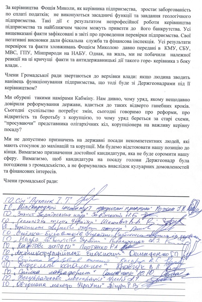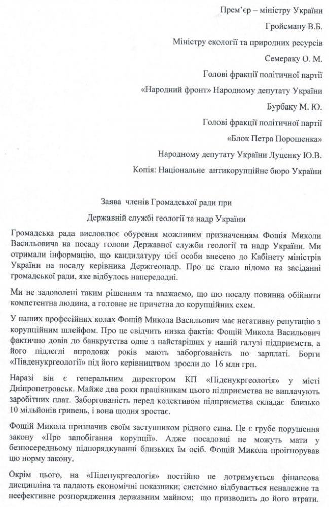Еще в пределе этого года Общественный совет при Государственной службе геологии и недр Украины в обращении премьер-министру Украины, министру экологии, главам фракций политических партий «Народный Форнт» и «Блок Петра Порошенко», а также Национального Стокоррупционного бюро Украины указал на нарушения Николаем Фощием ст.9 Закона Украины «О противодействии и предотвращении коррупции», поскольку будучи руководителем государственного предприятия он назначил своим заместителем собственного сына. Это прямо запрещено законодательством Украины.