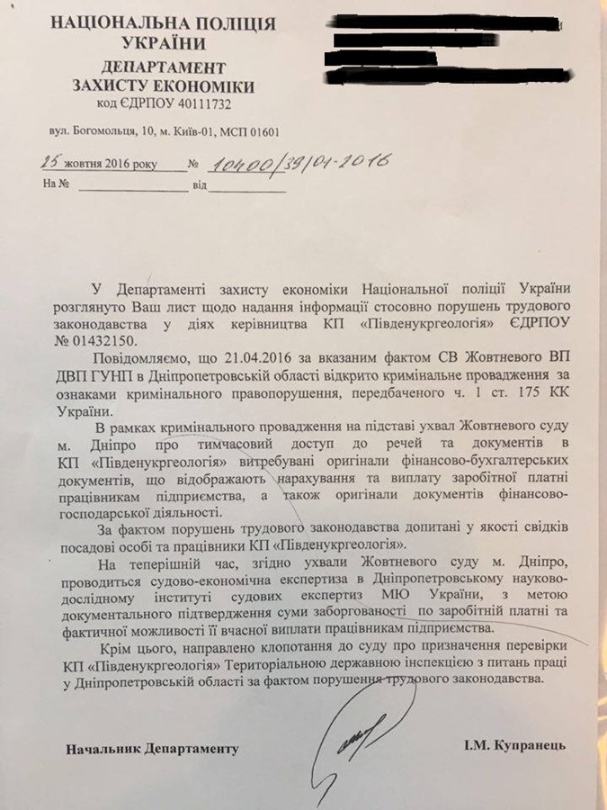 Жовтневим ВП ДВП ГУПН в Днепропетровской области осуществляется досудебное расследование в уголовном производстве №120160406500011716 от 21.04.2016 по признакам состава преступления, предусмотренного ч.1 ст.175 УК Украины. А это безосновательная невыплата заработной платы, содеянная преднамеренно.