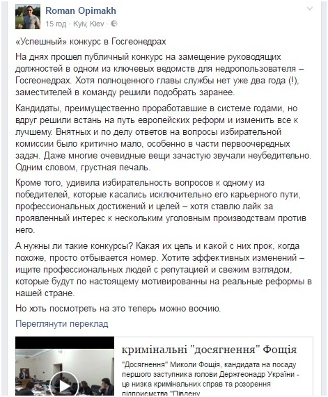 «Хотя полноценного руководителя службы нет уже два года (!), заместителей в команду решили подобрать заблаговременно. Кандидаты, которые проработали в системе годами, вдруг решили стать на путь европейских реформ и все изменить к лучшему. Четких и по делу ответов на вопросы избирательной комиссии было критически мало, особенно относительно первоочередных задач. Даже много очевидных вещей часто звучали неубедительно. Одним словом, мерзкая печаль. Кроме того, поразила избирательность вопросов к одному из победителей, которые касались исключительно его карьерного пути, профессиональных достижений и целей – хотя ставлю лайк за проявленное любопытство к нескольким уголовным производствам против него», – пишет Опимах. Поэтому глава Ассоциации газодобывающих компаний вообще ставит под сомнение потребность в таких конкурсах, ведь они себя дискредитировали. «Какова их цель и какая с них польза, когда, похоже, просто происходит номер. Хотите эффективных изменений – ищите профессиональных людей с репутацией и свежим взглядом, которые будут по-настоящему мотивированы на реальные реформы в нашей стране», – убеждает Опимах.