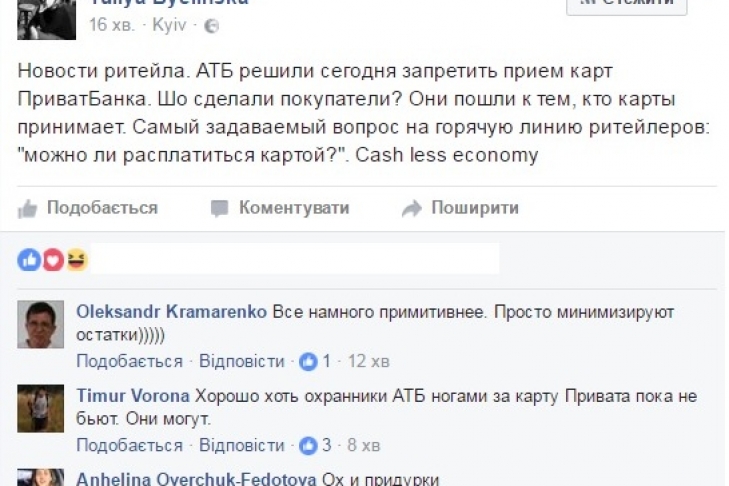«Новости ритейла. АТБ решили сегодня запретить прием карт ПриватБанка. Шо сделали покупатели? Они пошли к тем, кто карты принимает. Самый задаваемый вопрос на горячую линию ритейлеров: "можно ли расплатиться картой?". Cash less economy», - написала она.