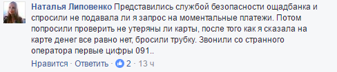"Спросили, не подавала ли я запрос на моментальные платежи. Потом попросили проверить, не утеряны ли карты, после того как я сказала, что на карте денег все равно нет, бросили трубку", – пишет Наталья Липовенко.