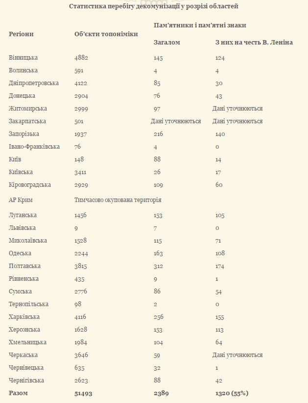 По данным, предоставленным ОГА Институту национальной памяти, по состоянию на декабрь 2016 года переименовано 51 493 объекта топонимики в городах, поселках и селах. Это — улицы, площади, скверы и тому подобное. В Украине демонтировано 2389 памятников и памятных знаков, из них в честь Ленина – 1320.