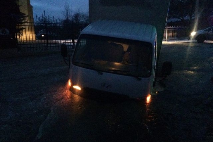 Грузовик во Львове провалился под асфальт, в результате чего на месте прорвало канализацию