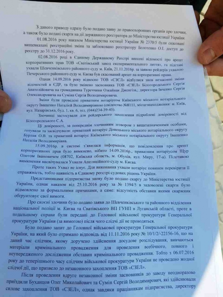 Все это сопровождалось внесением в уставные документы изменений о собственниках и директоре, а также изменение юридического адреса завода. Тогда предприятие обратилось в Минюст, чтобы Антирейдерская комиссия отменила изменения в реестр, говорит директор Сватовского завода Сергей Ивченко. «Нам было отказано по формальной причине, они якобы не видят оснований для отмены регистрационных решений. Для нас это было шоком. Мы снова подали заявку, надеемся на объективное рассмотрение нашей жалобы. Потому, что очень грубо отработали рейдеры в подделке документов и не заметить мошенничество в данной схеме просто невозможно», — сказал директор.