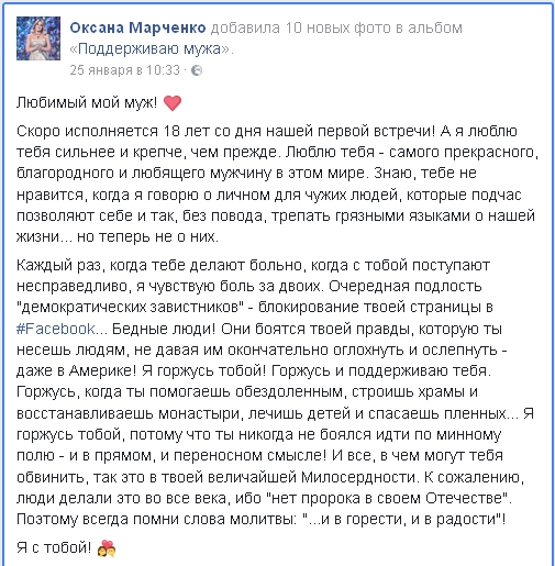 "Любимый мой, Муж! Скоро исполняется 18 лет со дня нашей первой встречи! А я люблю тебя сильнее и крепче, чем прежде. Люблю тебя - самого прекрасного, благородного и любящего мужчину в этом мире. Знаю, тебе не нравиться, когда я говорю о личном для чужих людей, которые подчас позволяют себе и так, без повода, трепать грязными языками о нашей жизни... но теперь не о них. Каждый раз, когда тебе делают больно, когда с тобой поступают несправедливо - я чувствую боль за двоих. Очередная подлость "демократических завистников" - блокирование твоей страницы в #Facebook... Бедные люди! Они бояться твоей правды, которую ты несешь людям, не давая им окончательно оглохнуть и ослепнуть - даже в Америке! Я горжусь тобой! Горжусь и поддерживаю тебя. Горжусь, когда ты помогаешь обездоленным, строишь храмы и восстанавливаешь монастыри, лечишь детей и спасаешь пленных... Я горжусь тобой, потому что ты никогда не боялся идти по минному полю - и в прямом, и переносном смысле! И все, в чем могут тебя обвинить, так это в твоей величайшей Милосердности. К сожалению, люди делали это во все века, ибо "...нет пророка в своем Отечестве..." Поэтому, всегда помни слова молитвы: "...и в горести, и в радости!" Я с тобой!", - написала телезвезда.