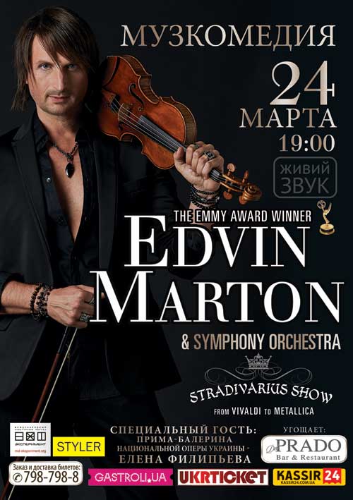 Впервые в Украине! 24 марта 2017 на сцене театра Музкомедии выступит всемирно известный скрипач-виртуоз, непревзойденный шоумен, лауреат премий Emmy, MTV и Eurovision - Эдвин Мартон (Edvin Marton)! Рожденный в Украине, он возвращается на Родину с взрывным концертом! Классика и современность, лирическая скрипка и бурные ритмы рока в невероятном музыкальном шоу «Stradivarius Show».