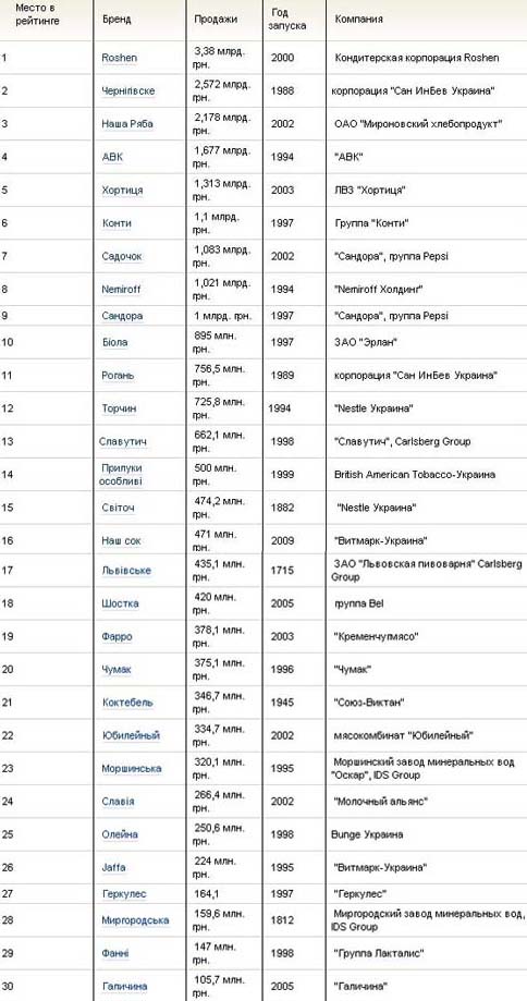 Свободный рынок независимой Украины способствовал появлению и стремительному развитию отечественных брендов, и именно они заняли лидирующие позиции в рейтинге издания «Фокус». На первом месте ТМ Roshen, которая появилась в 2000 году. По популярности она обогнала даже более зрелый пивной бренд – «Чернігівське». Эта ТМ, которая в рейтинге оказалась на втором месте, была запущена в 1988 году. Вообще, в списке половина – «питьевые» бренды. Третье место досталось курятине от ТМ «Наша ряба». Именно с этим брендом большинство потребителей ассоциирует натуральное, свежее куриное мясо, которое производит «Мироновский хлебопродукт». Хотя добиться таких ассоциаций производителю было непросто.