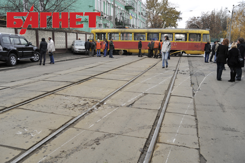 На Подоле допотопный трамвай сошел с рельсов