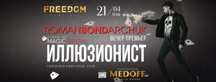Во FREEDOM Event Hall популярный иллюзионист, актер, телеведущий, консультант «Битвы экстрасенсов» и лауреат международных фестивалей и конкурсов Роман Бондарчук презентует не только шоу с высококлассными трюками, современными постановками, ментальным экспериментами и непревзойденным юмором в стиле Stand Up, но и покажет совершенно новые постановки. Так, Роман удивит «Появлением на сцене», а также презентует опасный для жизни номер «ПИКА», в котором проколет на сцене свое тело перед сотнями зрителей! Кроме того, зрителей ожидает сюрприз – в этот вечер на сцене выступит звёздный гость, молодой и талантливый исполнитель Даниил Клягин, который добавит вечеру романтики музыкальной премьерой.