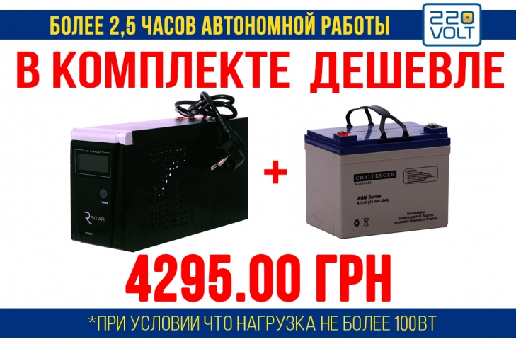 Украинский онлайн-магазин 220 Volt предложил комплект из ИБП RITAR RTSW-600, 12В Q4 и аккумулятора Challenger A12‒35, по акционной стоимости, составляющей 4295 грн. Акция действительна, пока наявный товар не будет распродан.