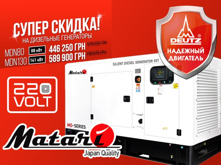 Магазин 220Volt снизил цены на японские автоматические дизельные генераторы Matari MDN80 и Matari MDN130. Приобрести генератор по акционной цене можно до полной распродажи оборудования со склада интернет-магазина.
