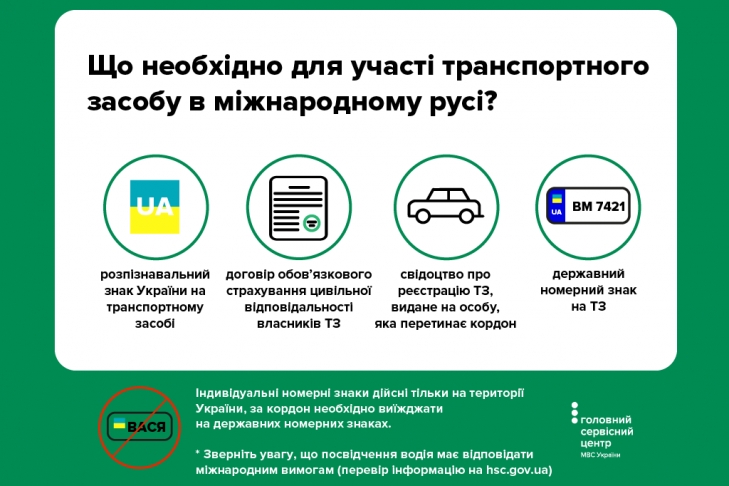 Водителям следует помнить, что индивидуальные номерные знаки транспортных средств действительны только на территории Украины, за границу необходимо выезжать на государственных номерных знаках.